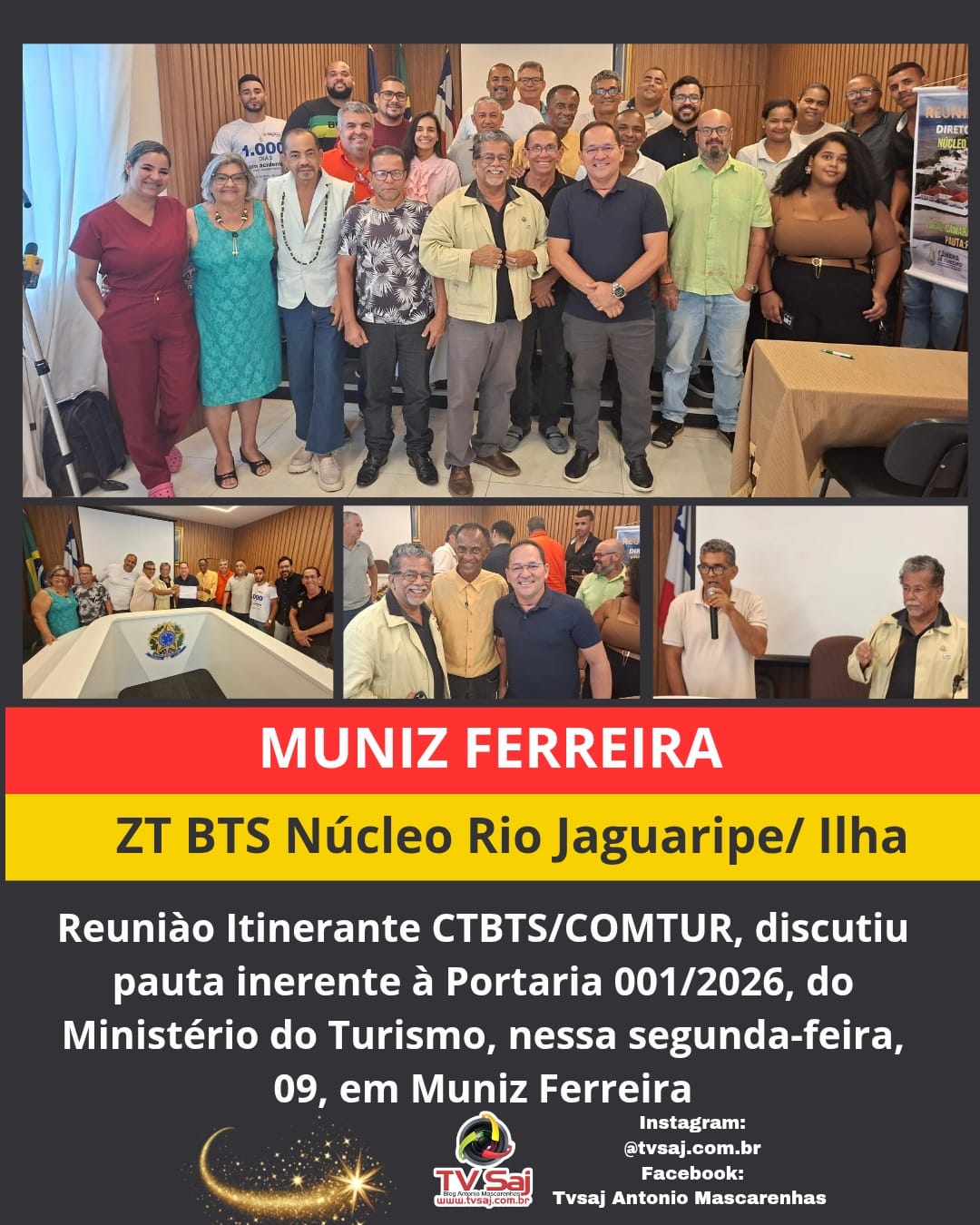 Realizada na manhã desta segunda-feira, 09, na Câmara de Vereadores de Muniz Ferreira, uma importante reunião itinerante da Diretoria da CTBTS/COMTUR, Núcleo ZT BTS – Rio Jaguaripe/Ilha, reuniu representantes de diversos municípios que integram a zona turística da Baía de Todos os Santos. O evento em apreço foi programado para participação dos municípios de Muniz Ferreira, Vera Cruz, Jaguaripe, Além de representantes de municípios em apreço, autoridades municipais e representantes de segmentos da sociedade civil interessados no fortalecimento do turismo regional.